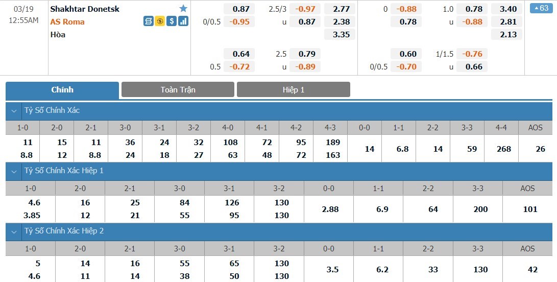 Dự đoán kèo tỷ số hiệp 1: Shakhtar Donetsk 0-2 AS Roma
