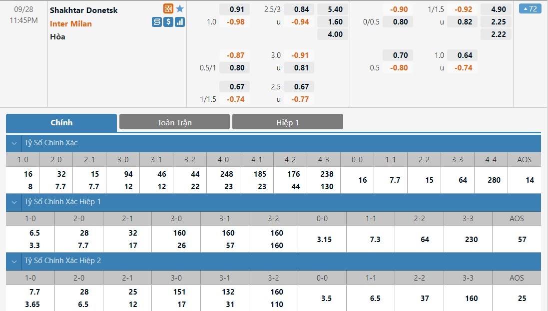 Inter vẫn sẽ được đánh giá cao hơn Shakhtar Donetsk rất nhiều ở trận này dù họ là đội phải làm khách. Tỷ lệ cược của Inter chỉ là 1 ăn 1.60 trong khi đó Shakhtar Donetsk có tỷ lệ cược lên tới 1 ăn 5.40. Tỷ số hòa có tỷ lệ cược là 1 ăn 4.00. Shakhtar Donetsk không phải một đội bóng yếu và họ cũng thường thi đấu khá khó chịu trên sân nhà. Sẽ là một trận đấu rủi ro cho Inter và ô cược hòa sẽ là lựa chọn cho kèo đấu này.