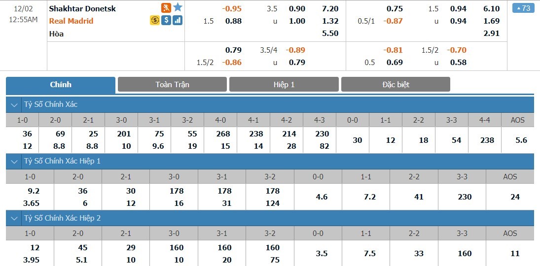 Real Madrid vẫn được đánh giá cao hơn Shakhtar Donetsk khá nhiều ở kèo đấu này. Tỷ lệ cược giành cho Real Madrid chỉ ở mức 1 ăn 1.32 trong khi Shakhtar Donetsk có tỷ lệ cược lên tới 1 ăn 7.20. Tỷ số hòa có tỷ lệ cược 1 ăn 5.50. Đây là lúc mà Real Madrid đang thi đấu cực kì bất ổn. Phải làm khách trước một Shakhtar Donetsk không hề yếu, Real Madrid có thể sẽ tiếp tục sảy chân và phải chia điểm ở trận này.