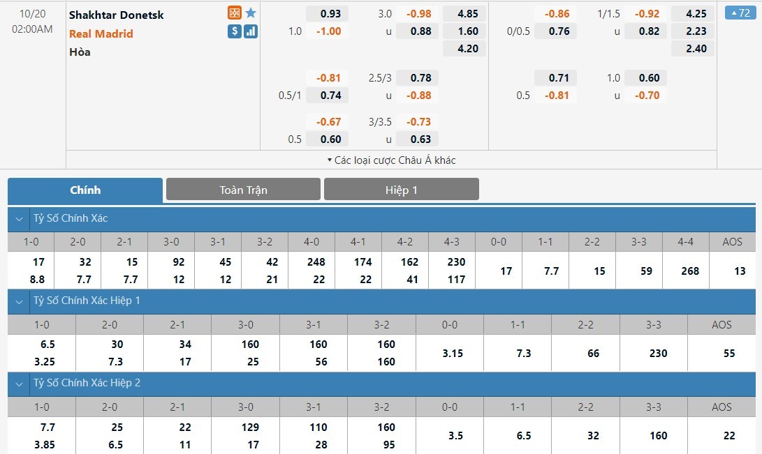 Real Madrid vẫn sẽ được đánh giá cao hơn Shakhtar Donetsk khá nhiều ở kèo đấu này. Tỷ lệ cược của đội khách chỉ là 1 ăn 1.60 trong khi đó đội chủ nhà có tỷ lệ cược lên tới 1 ăn 4.85. Tỷ số hòa có tỷ lệ cược là 1 ăn 4.20. Real Madrid đang có phong độ không tốt trong khi đó Shakhtar Donetsk đang thi đấu không quá tệ và có cơ sở để có thể mạo hiểm với ô cược hòa.