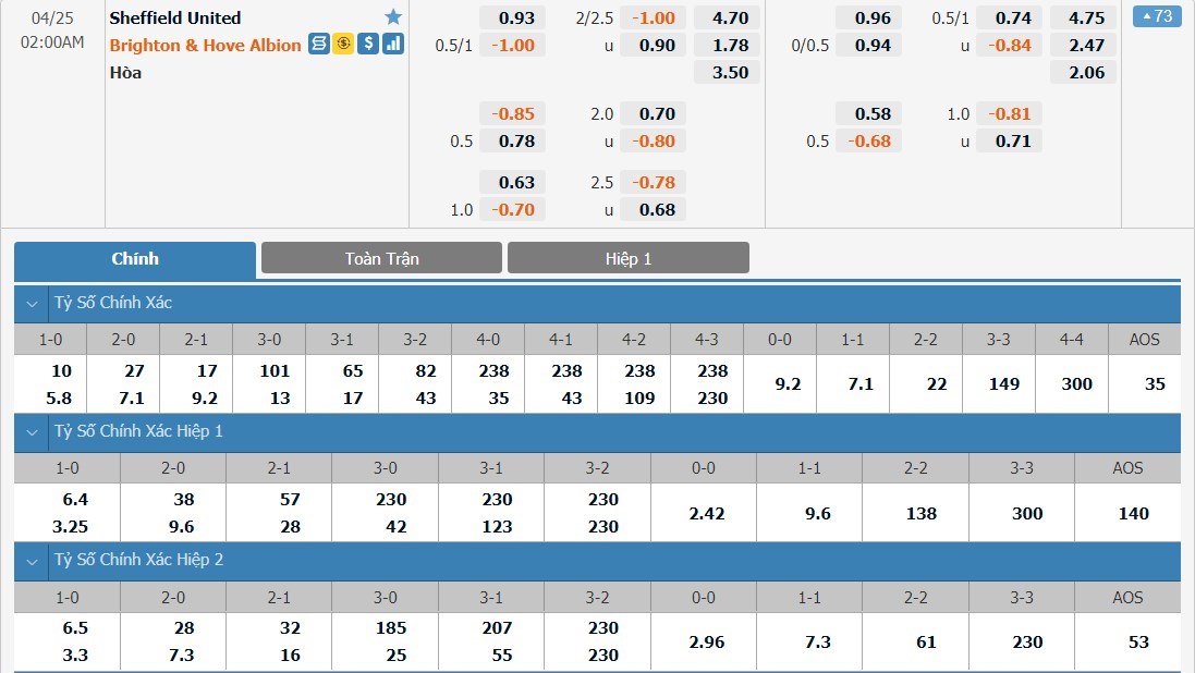 Không bất ngờ khi mà Brighton được đánh giá cao hơn Sheffield United khá nhiều ở trận này. Đội khách chỉ có tỷ lệ cược là 1 ăn 1.78 trong khi đó đội chủ nhà có tỷ lệ cược lên tới 1 ăn 4.70. Tỷ số hòa có tỷ lệ cược là 1 ăn 3.50. Sheffield United đã không còn động lực. Trước một đối thủ rất dễ chịu, Brighton sẽ không bỏ quá cơ hội giành 3 điểm trọn vẹn.