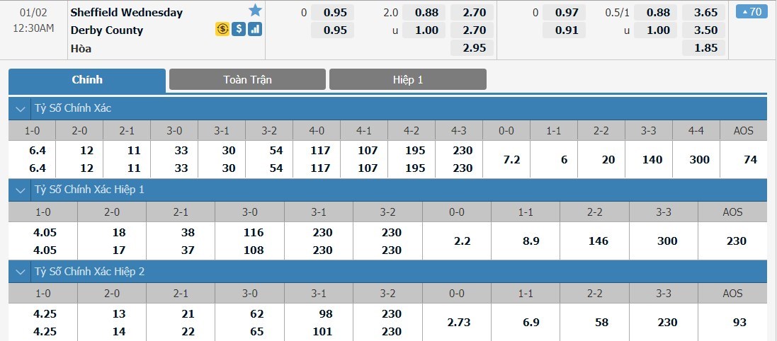 Tỷ lệ cược giành cho cả Sheffield Wednesday và Derby County ở kèo đấu này đều ở mức 1 ăn 2.70. Tỷ số hòa có tỷ lệ cược là 1 ăn 2.95. Derby County đang tỏ ra nhỉnh hơn đôi chút so với Sheffield Wednesday. Phong độ của đội khách ở những vòng đấu vừa qua cũng là không quá tệ và trước một đối thủ dưới cơ, Derby County sẽ đủ khả năng gành 1 chiến thắng.