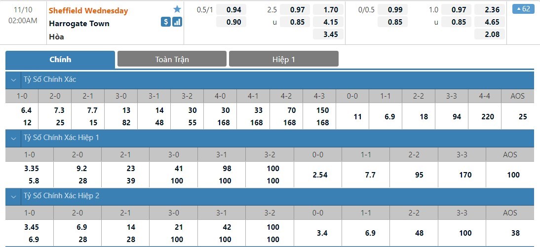 Dự đoán kèo tỷ số hiệp 1: Sheffield Wednesday 2-0 Harrogate Town