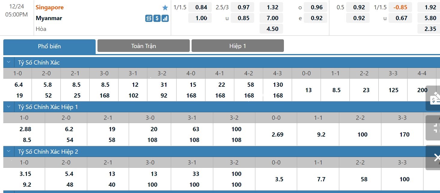 Dự đoán kèo tỷ số hiệp 1: Singapore 1-0 Myanmar