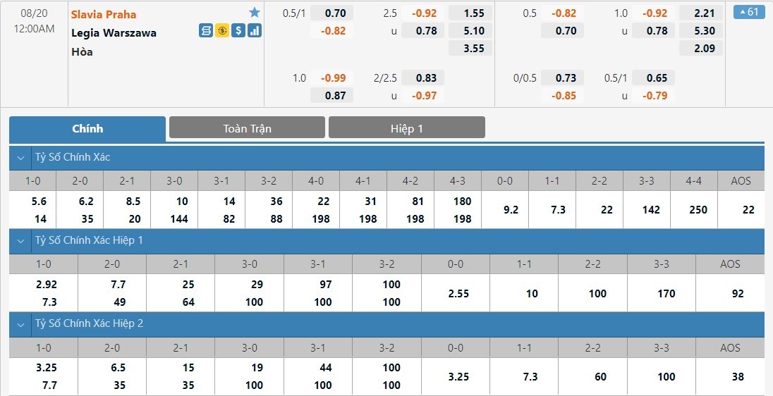 Soi kèo tổng quát Slavia Praha vs Legia Warszawa