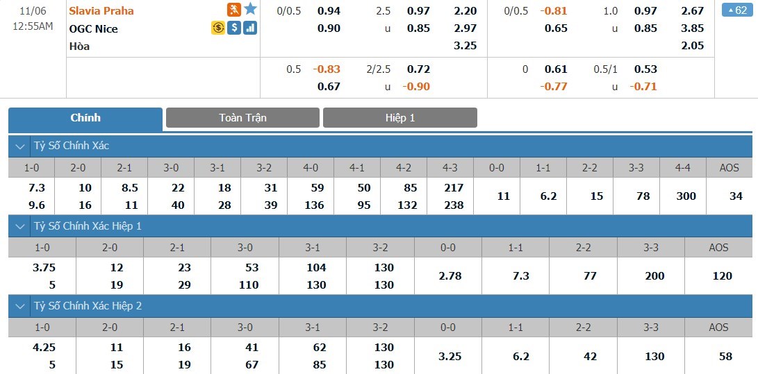 Dự đoán kèo tỷ số hiệp 1: Slavia Praha 0-0 Nice