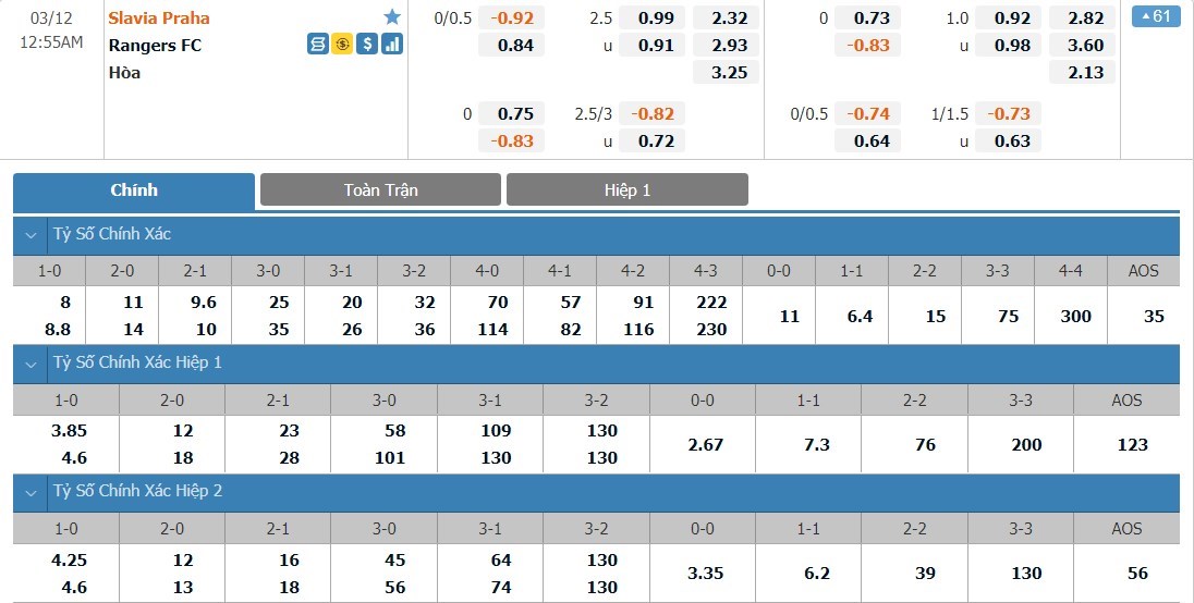 Dự đoán kèo tỷ số hiệp 1: Slavia Praha 0-2 Rangers