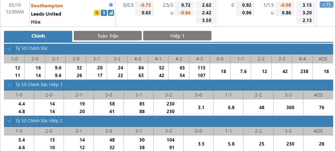 Tỷ lệ cược của Southampton và Leeds ở kèo đấu này gần như cân bằng. Southampton có tỷ lệ 1 ăn 2.62 trong khi đó Leeds có tỷ lệ 1 ăn 2.42. Tỷ số hòa có tỷ lệ cược cao nhất ở trận này với 1 ăn 3.50. Thực lực 2 đội đang không có sự chênh lệch quá lớn và hai đội cũng không còn quá nhiều mục tiêu. Ở kèo đấu này, ô cược hòa sẽ là lựa chọn hợp lý.