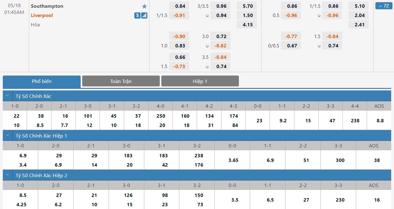 Tỷ lệ cược của Southampton và Liverpool ở kèo đấu này có sự chênh lệch rất lớn. Liverpool chỉ có tỷ lệ là 1 ăn 1.50 trong khi đó Southampton có tỷ lệ cược lên tới 1 ăn 5.70. Tỷ số hòa có tỷ lệ cược là 1 ăn 4.15. Liverpool vẫn đang có phong độ rất ổn định. Trước một Southampton không được đánh giá cao và cũng không còn nhiều động lực, Liverpool sẽ không bỏ qua cơ hội giành 3 điểm trọn vẹn để tiếp tục nuôi hi vọng cạnh tranh danh hiệu vô địch.