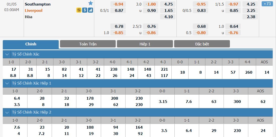 Liverpool vẫn được đánh giá cao hơn Southampton khá nhiều ở trận này. Đội khách có tỷ lệ cược là 1 ăn 1.65 trong khi đội chủ nhà có tỷ lệ cược 1 ăn 4.75. Tỷ số hòa có tỷ lệ cược là 1 ăn 4.10. Phong độ của Liverpool đang là không quá ổn định và họ cũng thường xuyên đánh rơi điểm trên sân khách ở quãng thời gian vừa qua. Đây sẽ là một chuyến làm khách rủi ro cho Liverpool và khả năng họ phải chia điểm với Southampton là không hề thấp.