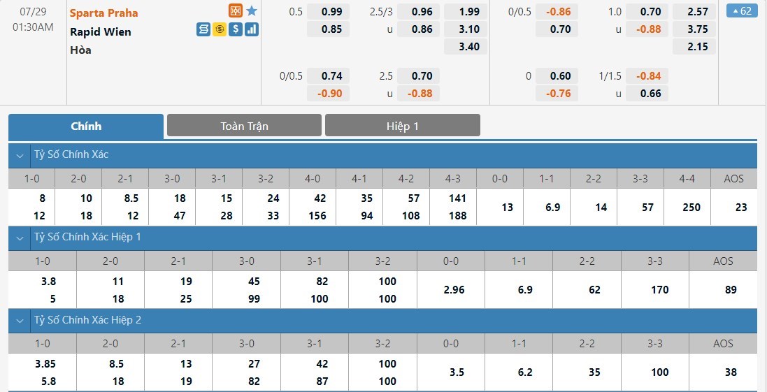 Dự đoán kèo tỷ số hiệp 1: Sparta Praha 1-1 Rapid Wien