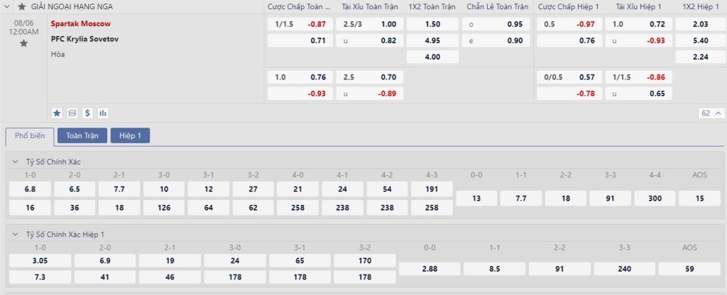Soi kèo tổng quát Spartak Moscow vs Krylya Sovetov Samara