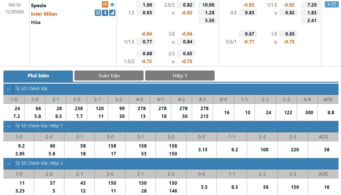 Soi kèo châu Á Spezia vs Inter Milan
