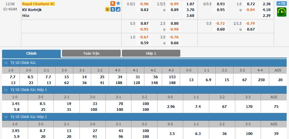 Kèo châu Á toàn trận: Kortrijk (FT)