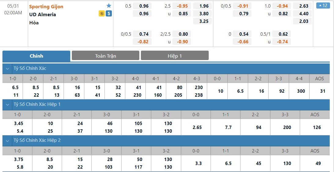 Dự đoán kèo tỷ số hiệp 1: Sporting Gijon 1-1 Almeria