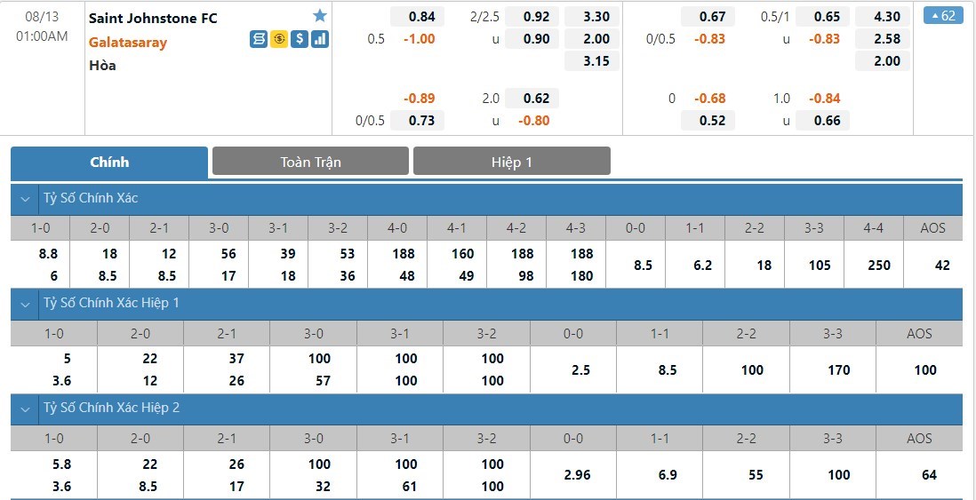 Dự đoán kèo tỷ số hiệp 1: St. Johnstone 0-0 Galatasaray