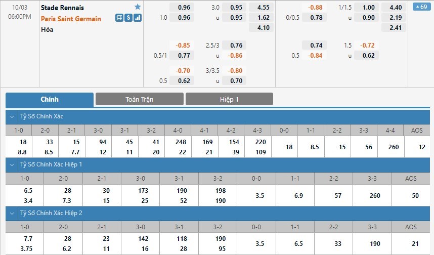 PSG vẫn sẽ được đánh giá cao hơn rất nhiều so với Rennes ở trận này. Đội khách chỉ có tỷ lệ cược là 1 ăn 1.62 trong khi đó đội chủ nhà có tỷ lệ cược lên tới 1 ăn 4.55. Tỷ số hòa có tỷ lệ cược là 1 ăn 4.10. PSG lúc này đang tỏ ra quá mạnh so với Rennes và đội chủ nhà sẽ rất khó để tránh được một thất bại.