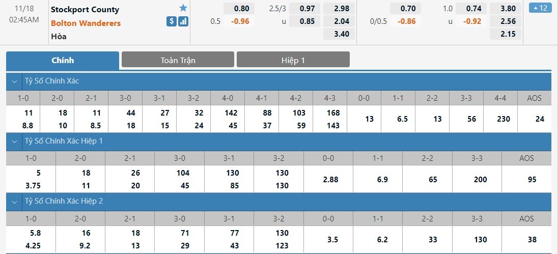 Bolton vẫn sẽ là cửa trên ở trận này dù họ phải đá sân khách. Tỷ lệ cược của Bolton chỉ là 1 ăn 2.04 trong khi đó Stockport có tỷ lệ cược lên tới 1 ăn 2.98. Tỷ số hòa có tỷ lệ cược là 1 ăn 3.40. Stockport đang thi đấu khá khó chịu. Trước một Bolton cũng không được đánh giá quá cao, Stockport hoàn toàn có thể sẽ tiếp tục cầm hòa được đối thủ ở 90 phút thi đấu chính thức.