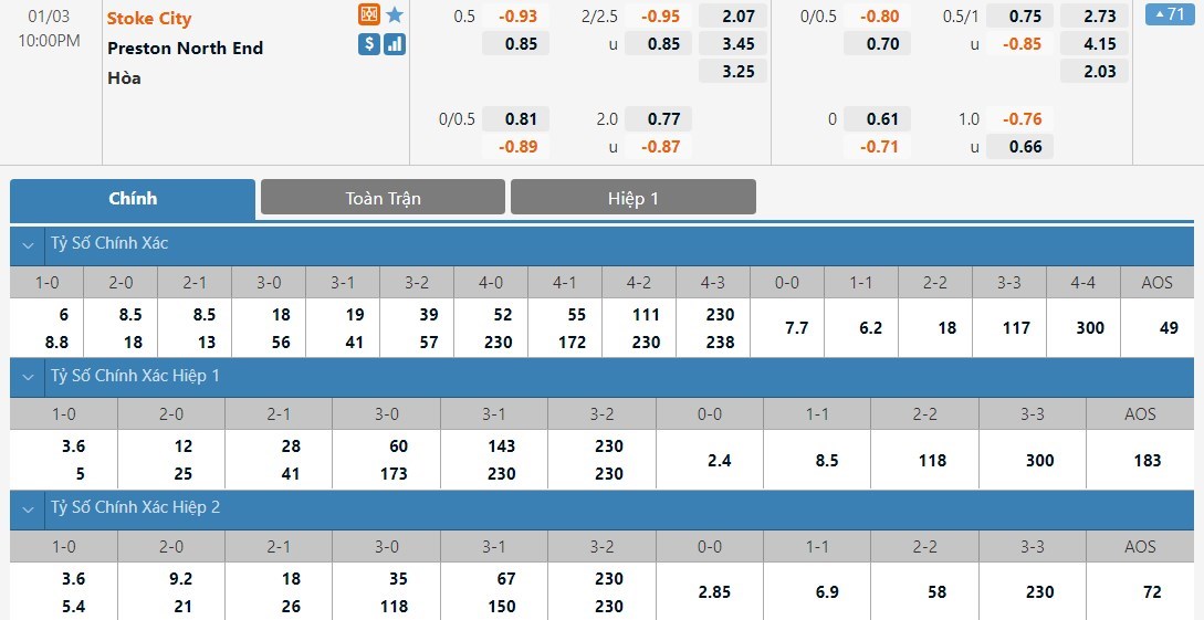 Stoke sẽ là cửa trên ở trận này với tỷ lệ cược 1 ăn 2.07. Preston có tỷ lệ cược là 1 ăn 3.45 trong khi đó tỷ số hòa có tỷ lệ cược là 1 ăn 3.25. Stoke lúc này đang sa sút phong độ. Trong khi đó Preston đang có những màn trình diễn không hề tệ và đội khách được dự đoán sẽ có được 1 điểm ở chuyến làm khách này.