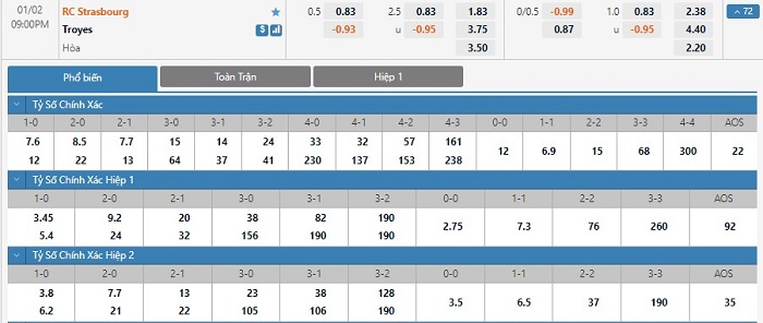 Trong 5 trận đấu gần nhất trên mọi đấu trường, Strasbourg đã mang về cho mình 5 pha lập công cùng với 9 lần phải vào lưới nhặt bóng. Bên kia chiến tuyến, Troyes đã sở hữu 2 bàn thắng, còn lại là việc hàng thủ đã phải nhận 4 bàn thua. Ở 5 lần đối đầu trực tiếp nhau thì đã có 3 trận đấu kết thúc với tổng số bàn thắng từ 3 trở lên. Các nhà đầu tư nên tin tưởng vào khả năng nổ Tài ở cuộc đối đầu này với tỷ lệ tài xỉu là 2 3/4 trái.