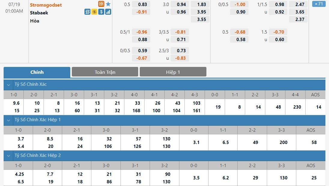Được chơi trên sân nhà, Stromsgodset sẽ được đánh giá cao hơn Stabaek khá nhiều ở kèo đấu này. Tỷ lệ cược của Stromsgodset chỉ là 1 ăn 1.83 trong khi đó Stabaek có tỷ lệ cược lên tới 1 ăn 3.95. Tỷ số hòa có tỷ lệ cược là 1 ăn 3.55. Stabaek đang thi đấu rất tệ và họ đang bị đánh giá rất thấp. Được chơi trên sân nhà trước một đối thủ đang chìm trong khủng hoảng, Stromsgodset sẽ có chiến thắng ở trận này.