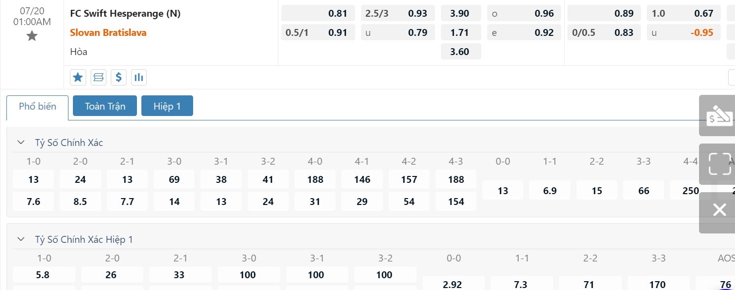 Soi kèo tổng quát Swift Hesperange vs Slovan Bratislava