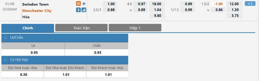 Man City sẽ được đánh giá cao hơn Swindon khá nhiều ở kèo đấu này. Tỷ lệ cược của Man City chỉ là 1 ăn 1.04 trong khi đó Swindon có tỷ lệ cược là 1 ăn 18.00. Tỷ số hòa có tỷ lệ cược là 1 ăn 9.80. Man City và Swindon đang có sự cách biệt quá lớn về trình độ và sẽ không có cơ hội để Swindon có thể tạo ra được những bất ngờ ở trận đấu này.