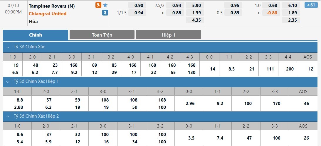 Chiangrai United sẽ được đánh giá cao hơn Tampines Rovers ở trận này và họ sẽ có tỷ lệ cược rất thấp. Dù vậy đây là kèo đấu mà người chơi không nên mạo hiểm khi mà Tampines Rovers đang tỏ ra quá yếu đuối. Cũng đã chắc chắn bị loại, Tampines Rovers đang buông xuôi và sẽ không bất ngờ nếu họ tiếp tục thua trước Chiangrai United ở trận này.