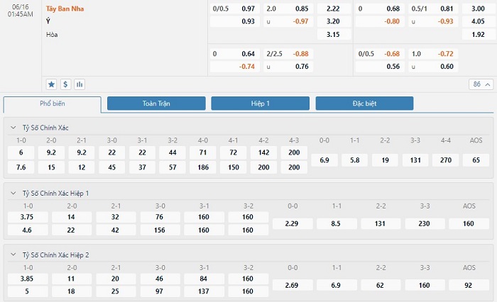 Soi kèo tài xỉu, kèo tỷ số Tây Ban Nha vs Italia