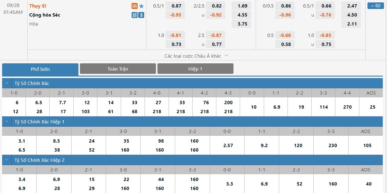 Kèo châu Âu hiệp 1: Thụy Sĩ