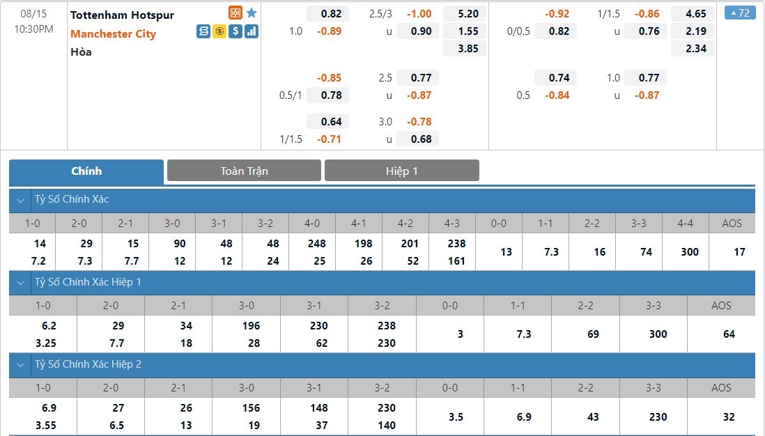 Man City đang có khởi đầu không thực sự ấn tượng ở đầu mùa giải năm nay. Ở trận tranh Siêu Cúp Anh vừa qua, Man City bất ngờ để thua trước Leicester trên loạt sút luân lưu. Chưa có được phong độ tốt nhất, Man City có thể sẽ gặp rất nhiều khó khăn ở chuyến làm khách này khi mà đối thủ của họ là một Tottenham không hề dễ chơi. Sau một mùa giải thất bại, Tottenham đang cho thấy quyết tâm ở mùa giải năm nay và họ cũng đã có những màn thể hiện khá tốt ở loạt trận giao hữu đầu mùa. Ở cả 4 trận đấu gần nhất của mình, cửa cược Tottenham đều thắng kèo. Trên sân nhà, Tottenham cũng thường tỏ ra khá khó chịu và được chấp khá sâu, cửa dưới Tottenham sẽ là lựa chọn không tệ cho kèo đấu này.