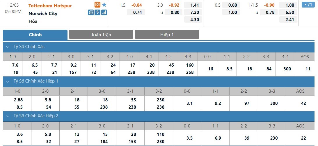 Dự đoán kèo tỷ số hiệp 1: Tottenham Hotspur 0-0 Norwich City