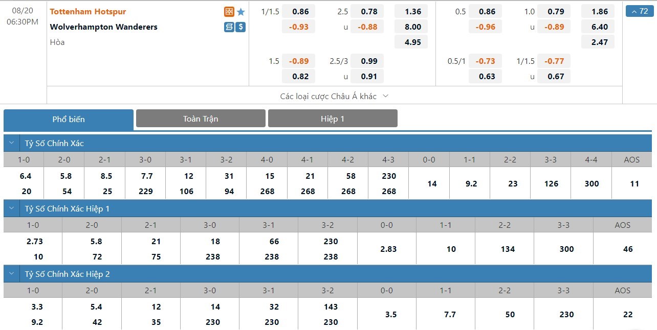 Không thắng ở 2 vòng đấu đầu tiên tuy nhiên Wolverhampton vẫn là cái tên không thể bị coi thường. Đội bóng này có thể tấn công không quá ấn tượng nhưng họ có khả năng phòng ngự rất chắc chắn và ở thế cửa dưới, Wolverhampton được đánh giá vẫn sẽ là một lựa chọn không quá tệ. Tottenham của Conte cũng không phải đội bóng quá mạnh ở mặt trận tấn công và trước một đối thủ phòng ngự tốt họ sẽ khó thắng đậm. Trong 10 lần gần nhất 2 đội gặp nhau, cũng chỉ đúng 1 lần Tottenham thắng được Wolverhampton với cách biệt trên 1 bàn. Với tỷ lệ chấp rất sâu lên tới 1 1/4 trái, cửa dưới Wolverhampton sẽ là lựa chọn được đánh giá cao hơn ở kèo đấu này.