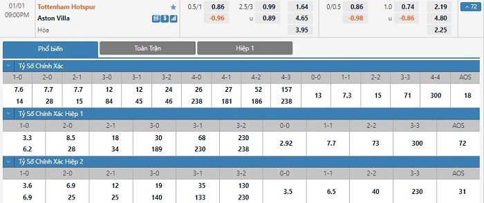 Soi kèo tổng quát Tottenham vs Aston Villa