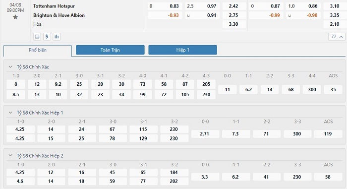 Soi kèo tài xỉu, kèo tỷ số Tottenham vs Brighton