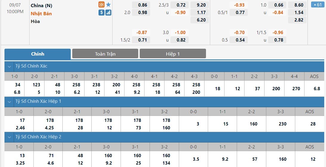 Dự đoán kèo tỷ số hiệp 1: Trung Quốc 0-2 Nhật Bản