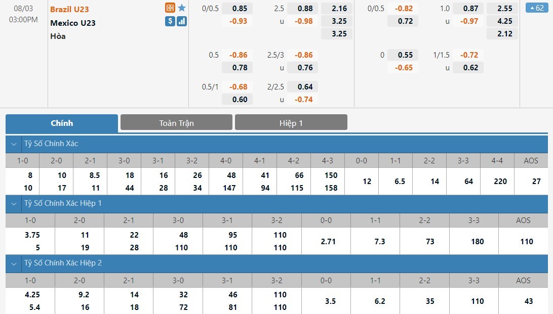 Dự đoán kèo tỷ số hiệp 1: U23 Brazil 1-1 U23 Mexico