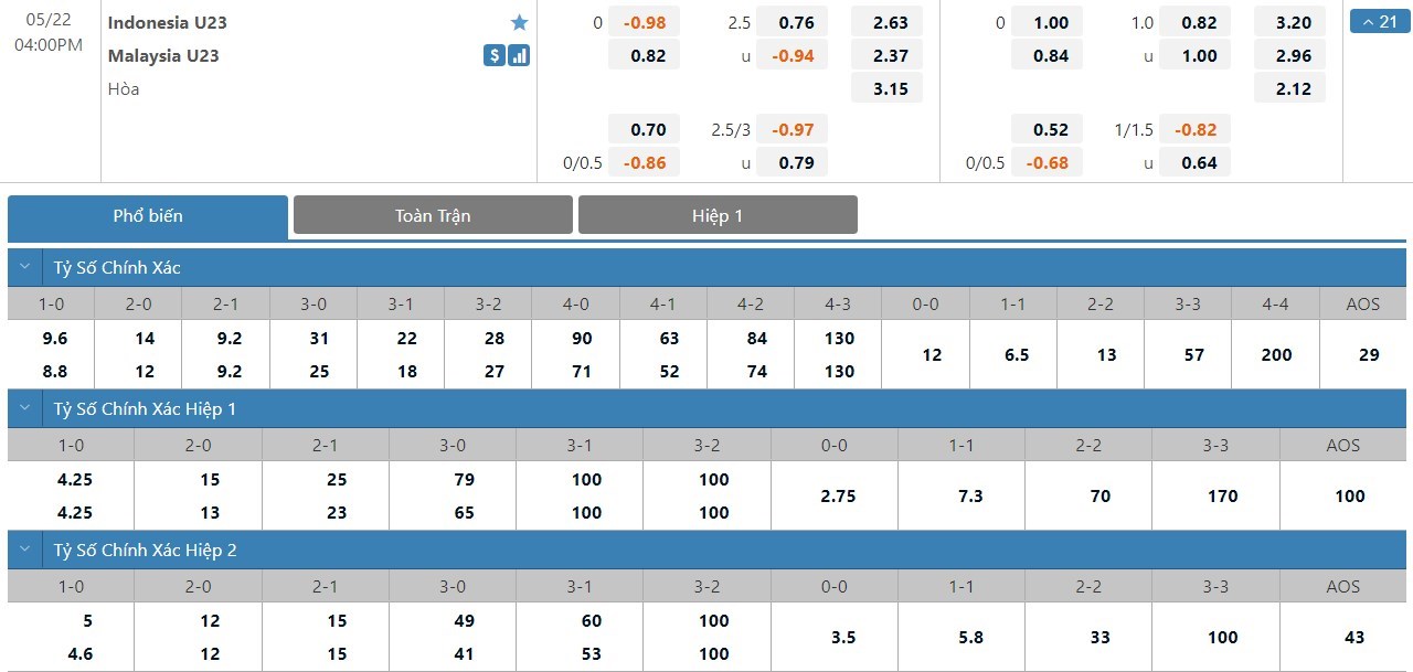 Dự đoán kèo tỷ số hiệp 1: U23 Indonesia 0-2 U23 Malaysia