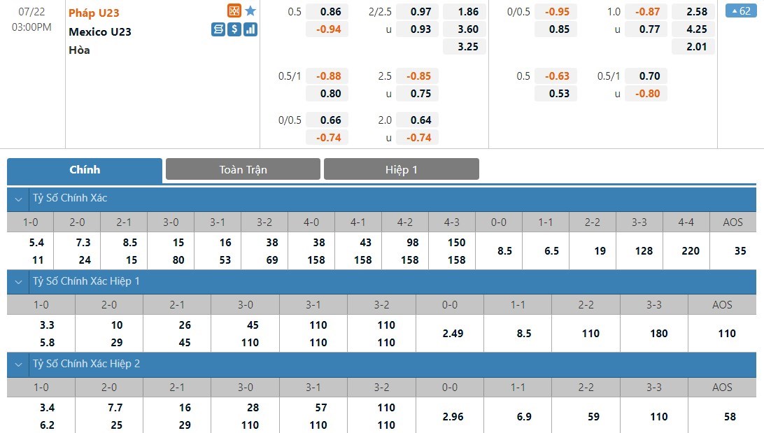 Dự đoán kèo tỷ số hiệp 1: U23 Pháp 0-0 U23 Mexico