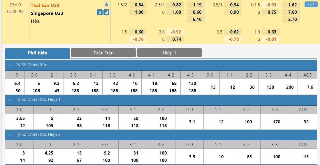 Dự đoán kèo tỷ số hiệp 1: U23 Thái Lan 1-1 U23 Singapore