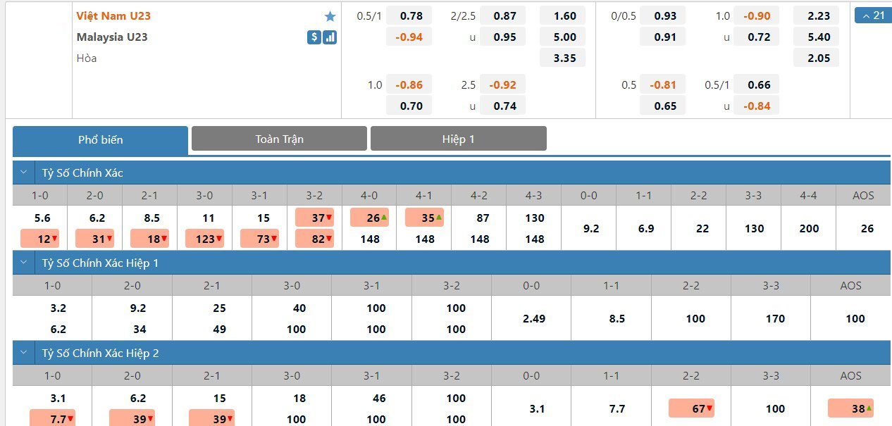 Kèo châu Á hiệp 1: U23 Malaysia (HT)