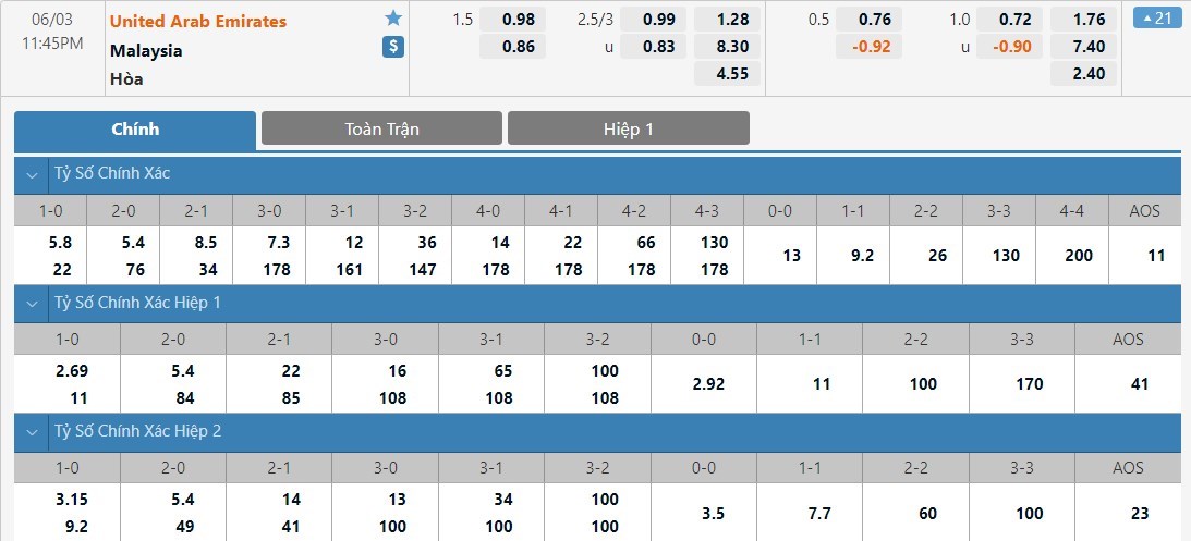 Dự đoán kèo tỷ số hiệp 1: UAE 1-1 Malaysia