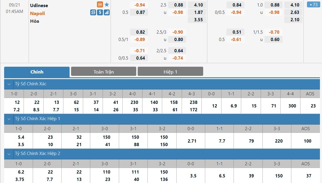 Dự đoán kèo tỷ số hiệp 1: Udinese 0-2 Napoli
