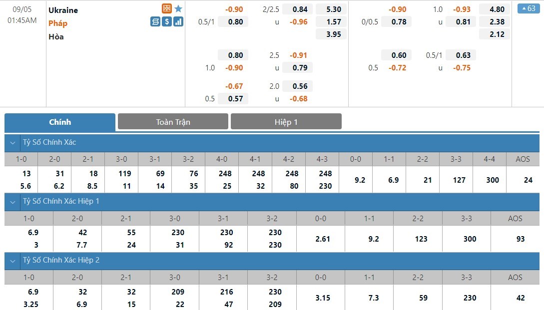 Dự đoán kèo tỷ số hiệp 1: Ukraine 1-1 Pháp