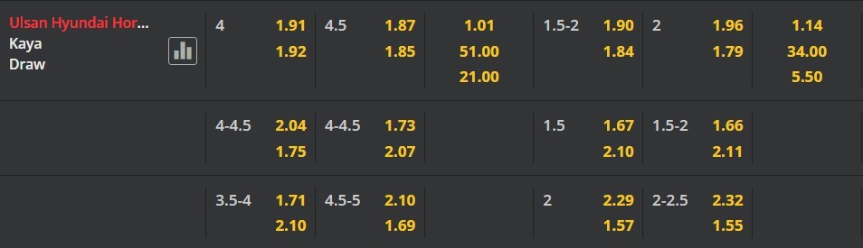 Tỷ lệ cược của Ulsan Hyundai và Kaya ở kèo đấu này sẽ có một sự chênh lệch cực kì lớn. Ulsan Hyundai chắc chắn sẽ được đánh giá cao hơn Kaya rất nhiều ở kèo đấu này. Đội bóng Philippines đang tỏ ra quá yếu đuối và cơ hội để Kaya có thể tạo ra bất ngờ ở trận này có thể nói là bằng 0.
