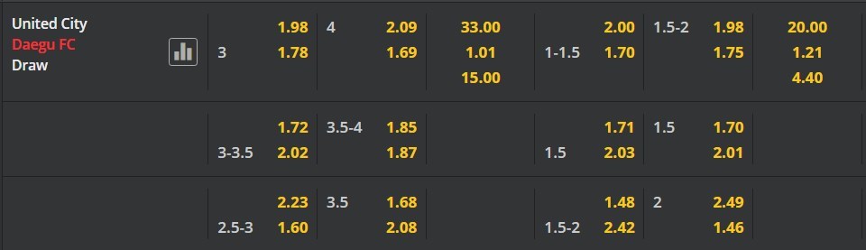 Tỷ lệ cược của Daegu và United City vẫn sẽ có sự chênh lệch rất lớn ở kèo đấu này. Chắc chắn là Daegu vẫn đang được đánh giá cao hơn United City rất nhiều. So với Daegu, United City vẫn đang thua kém hoàn toàn và họ sẽ phải nhận thêm 1 thất bại ở trận này.