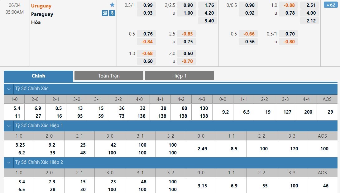 Uruguay vẫn được đánh giá cao hơn Paraguay khá nhiều ở kèo đấu này. Tỷ lệ cược của Uruguay chỉ là 1 ăn 1.76 trong khi Paraguay có tỷ lệ cược là 1 ăn 4.20. Tỷ số hòa có tỷ lệ cược là 1 ăn 3.40. Paraguay đang cho thấy một lối chơi chắc chắn và sẽ là không dễ để Uruguay có được 3 điểm ở trận này dù họ được chơi trên sân nhà. Ở kèo đấu này, ô cược hòa sẽ là lựa chọn được đánh giá cao.