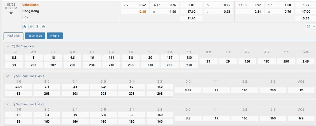 Dự đoán kèo tỷ số hiệp 1: Uzbekistan 2-0 Hồng Kông