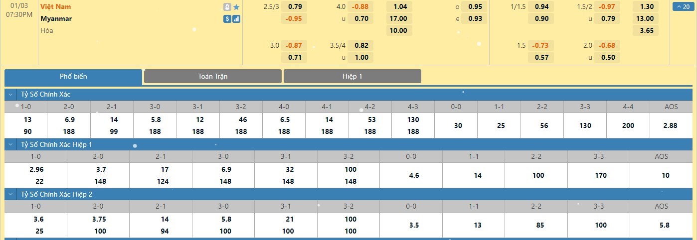 Soi kèo tài xỉu, kèo tỷ số Việt Nam vs Myanmar