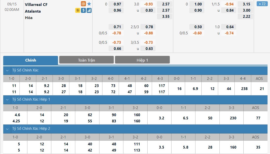 Tỷ lệ cược của Villarreal và Atalanta ở kèo này hoàn toàn cân bằng nhau và đều ở mức 1 ăn 2.57. Tỷ số hòa có tỷ lệ cược cao hơn đôi chút với 1 ăn 3.55. Có thể thấy 2 đội đang tỏ ra khá ngang sức và không đội nào đang vượt trội hoàn toàn so với đối thủ. Ở kèo đấu này, ô cược hòa sẽ là lựa chọn được đánh giá cao.
